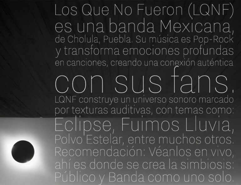Inspirados por la nostalgia y el rock en español, LQNF ha desarrollado un sonido que combina guitarras melódicas con atmósferas intensas, creando una experiencia tanto íntima como explosiva.Con lanzamientos como “Y Volveré”, un homenaje renovado al clásico de Los Ángeles Negros, y canciones originales como “Fuimos Lluvia” y “Cíclico”, LQNF ha construido un universo visual y sonoro que explora los fantasmas del pasado, los amores que no regresan y los sentimientos que nunca mueren.